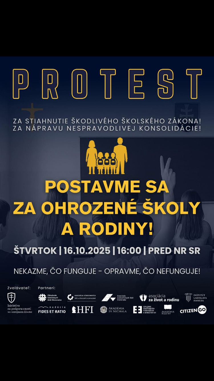 Dovoľte mi pozvať vás na PROTEST, ktorý sa uskutoční tento štvrtok 16.10. o 16:00 pri slovenskom parlamente. Postavme sa spolu proti škodlivej novele ministra Druckera, ktorá stavia cirkevné a súkromné školy pred Sofiinu voľbu - buď stratia svoju identitu a opustia poslanie, pre ktoré vznikli. Alebo prídu o 20% peňazí z normatívov. Rodičia tak budú musieť platiť zhruba 600€ ročne za každé dieťa na cirkevmej či súkromnej škole.